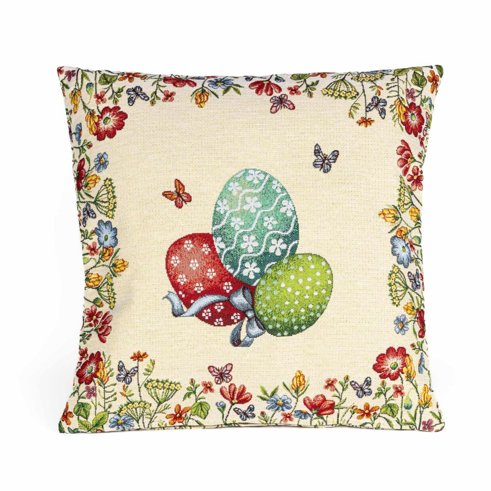 Dekorační povlak na polštářek v retro provedení z hustě tkané látky (gobelín) s vysokou gramáží se vzorem velikonočních vajíček s květinami, který tvoří rámeček kolem povlaku v rozměru 45 x 45 cm. Vzor na povlaku je oboustranný. Povlak na polštářek je vyroben ze 70% polyesteru a 30% bavlny. Zapínání na ZIP. Povlak je možné objednat samostatně bez výplně, s levnější dekorační výplní nebo luxusnější výplní na spaní.