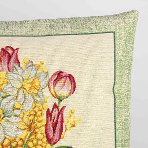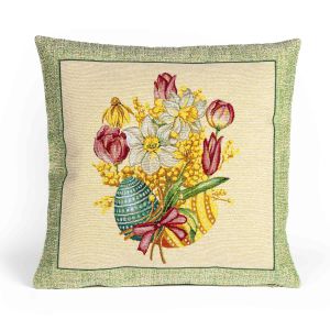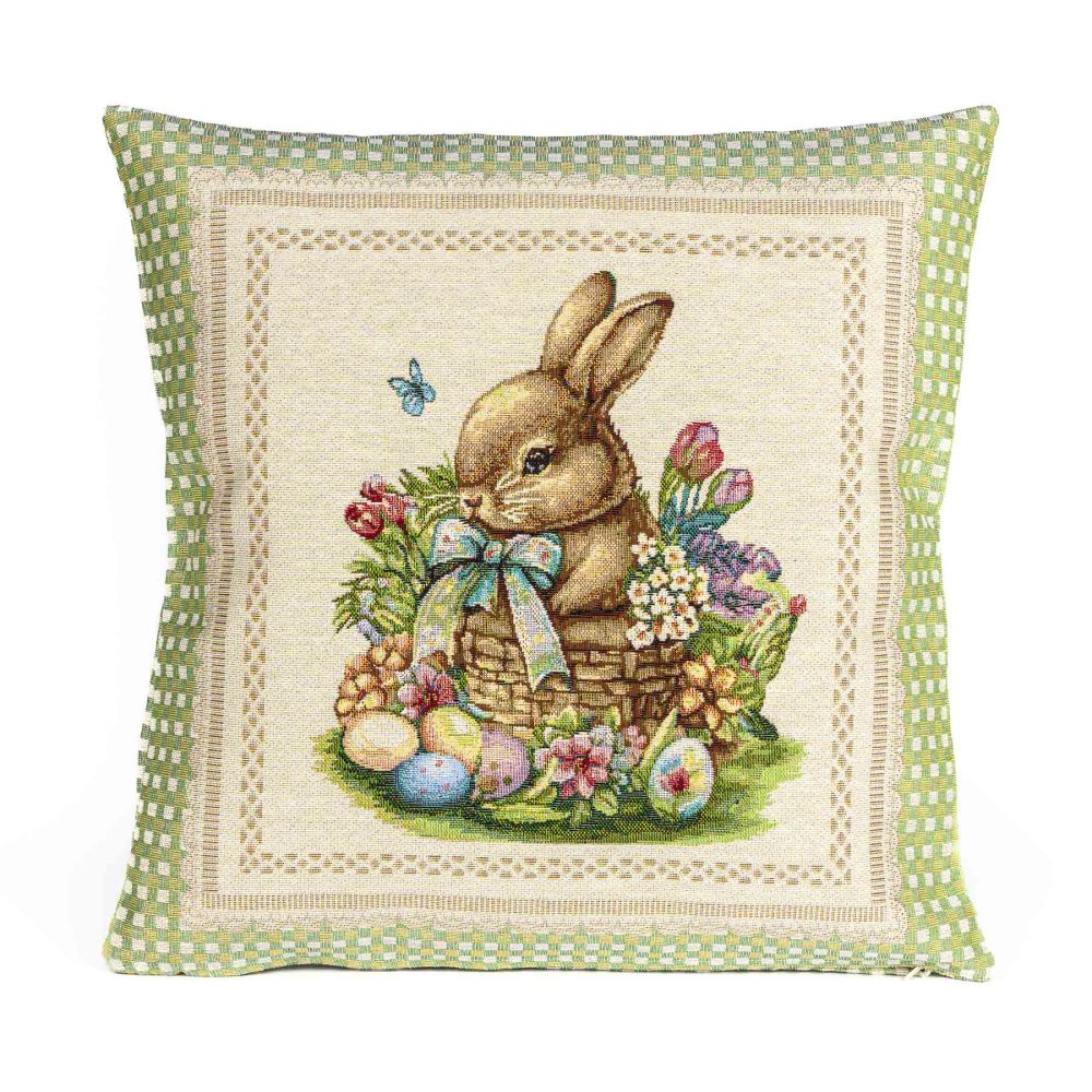 Dekorační povlak na polštářek v retro provedení z hustě tkané látky (gobelín) s vysokou gramáží se vzorem velikonočních vajíček se zajíčkem v zeleném rámečku v rozměru 45 x 45 cm. Vzor na povlaku je oboustranný. Povlak na polštářek je vyroben ze 70% polyesteru a 30% bavlny. Zapínání na ZIP. Povlak je možné objednat samostatně bez výplně, s levnější dekorační výplní nebo luxusnější výplní na spaní.