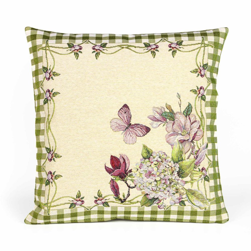Dekorační povlak na polštářek v retro provedení z hustě tkané látky (gobelín) s vysokou gramáží se vzorem fialových květin v zeleném kostkovaném rámečku v rozměru 45 x 45 cm. Vzor na povlaku je oboustranný. Povlak na polštářek je vyroben ze 70% polyesteru a 30% bavlny. Zapínání na ZIP. Povlak je možné objednat samostatně bez výplně, s levnější dekorační výplní nebo luxusnější výplní na spaní.