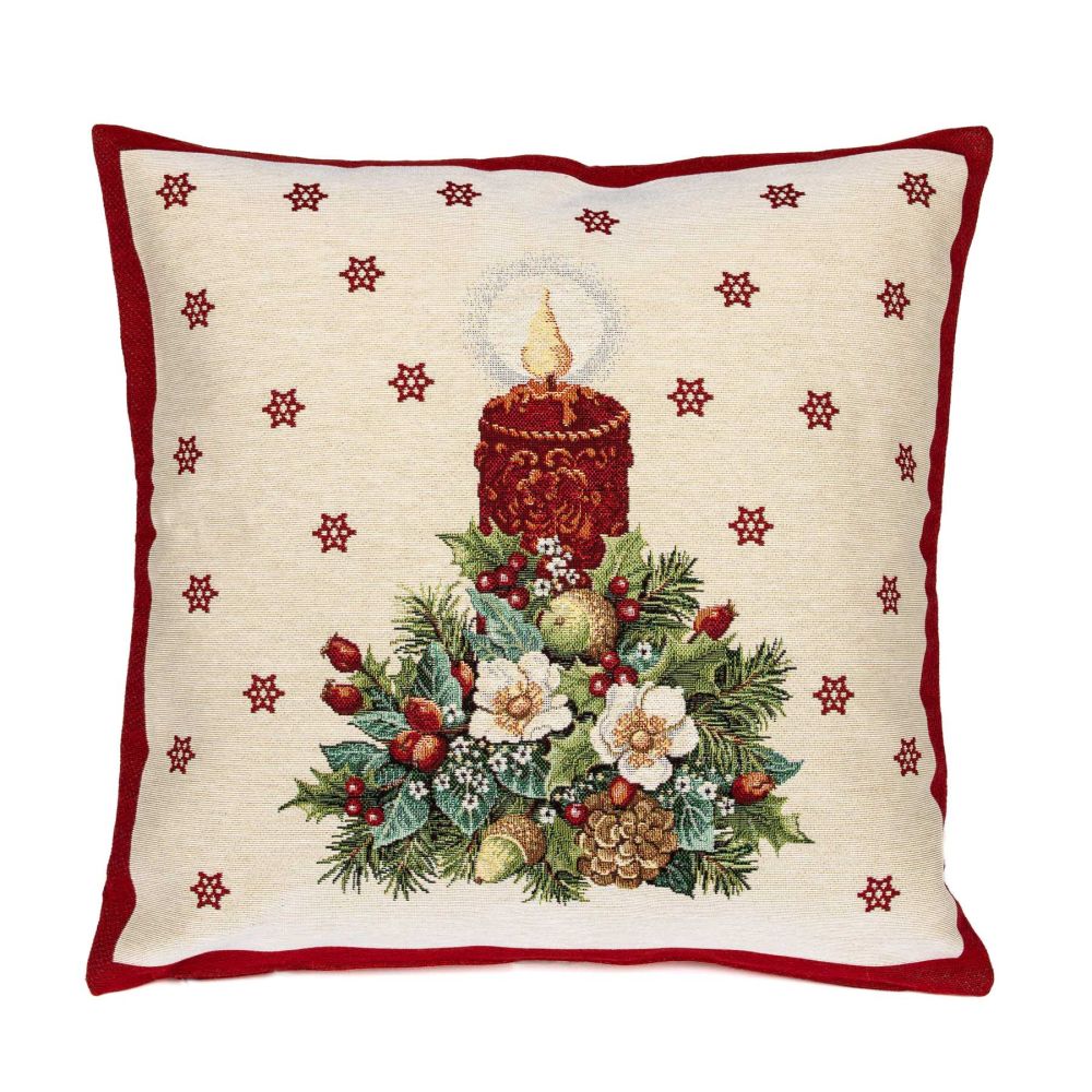Dekorační povlak na polštářek v retro provedení z hustě tkané látky (gobelín) s vysokou gramáží se vzorem červené svíčky s vánočním dekoracemi a vločkami na béžovém podkladu v rozměru 45 x 45 cm. Vzor na povlaku je oboustranný. Povlak na polštářek je vyroben ze 70% polyesteru a 30% bavlny. Zapínání na ZIP. Povlak je možné objednat samostatně bez výplně, s levnější dekorační výplní nebo luxusnější výplní na spaní.