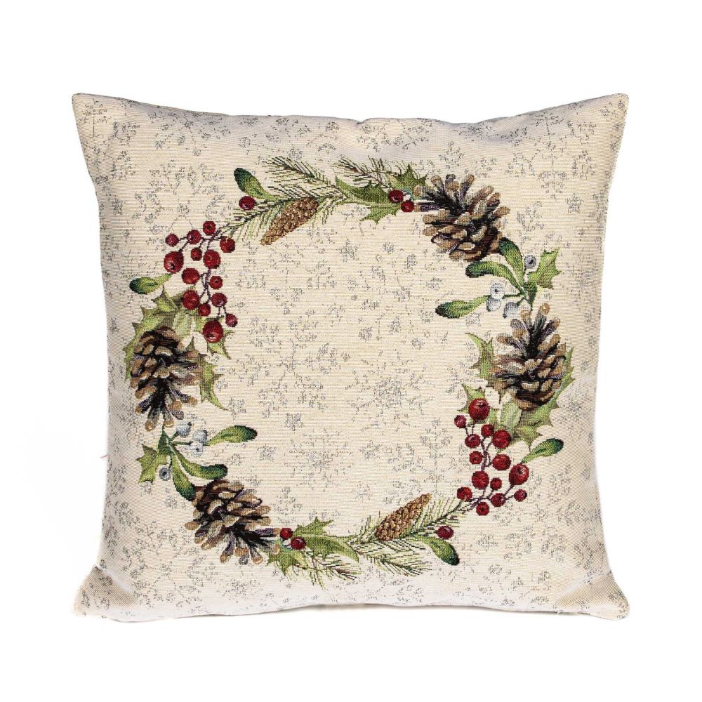 Dekorační povlak na polštářek v retro provedení z hustě tkané látky (gobelín) s vysokou gramáží se vzorem dekoračního věnečku se šišek na béžovém podkladu s vločkami v rozměru 45 x 45 cm. Vzor na povlaku je oboustranný. Povlak na polštářek je vyroben ze 70% polyesteru a 30% bavlny. Zapínání na ZIP. Povlak je možné objednat samostatně bez výplně, s levnější dekorační výplní nebo luxusnější výplní na spaní.