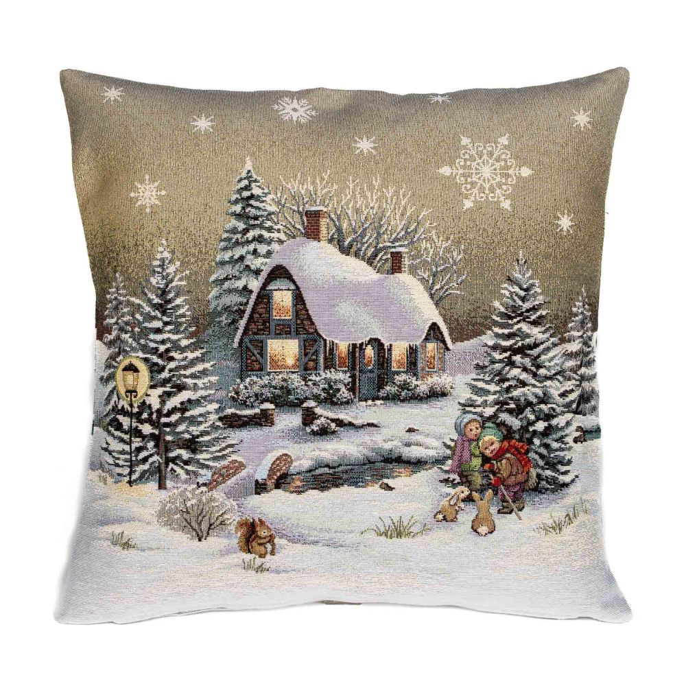 Dekorační povlak na polštářek v retro provedení z hustě tkané látky (gobelín) s vysokou gramáží se vzorem zasněžené chaloupky s dětmi z dob minulých v popředí v šedo-béžových barvách v rozměru 45 x 45 cm. Vzor na povlaku je oboustranný. Povlak na polštářek je vyroben ze 70% polyesteru a 30% bavlny. Zapínání na ZIP. Povlak je možné objednat samostatně bez výplně, s levnější dekorační výplní nebo luxusnější výplní na spaní.