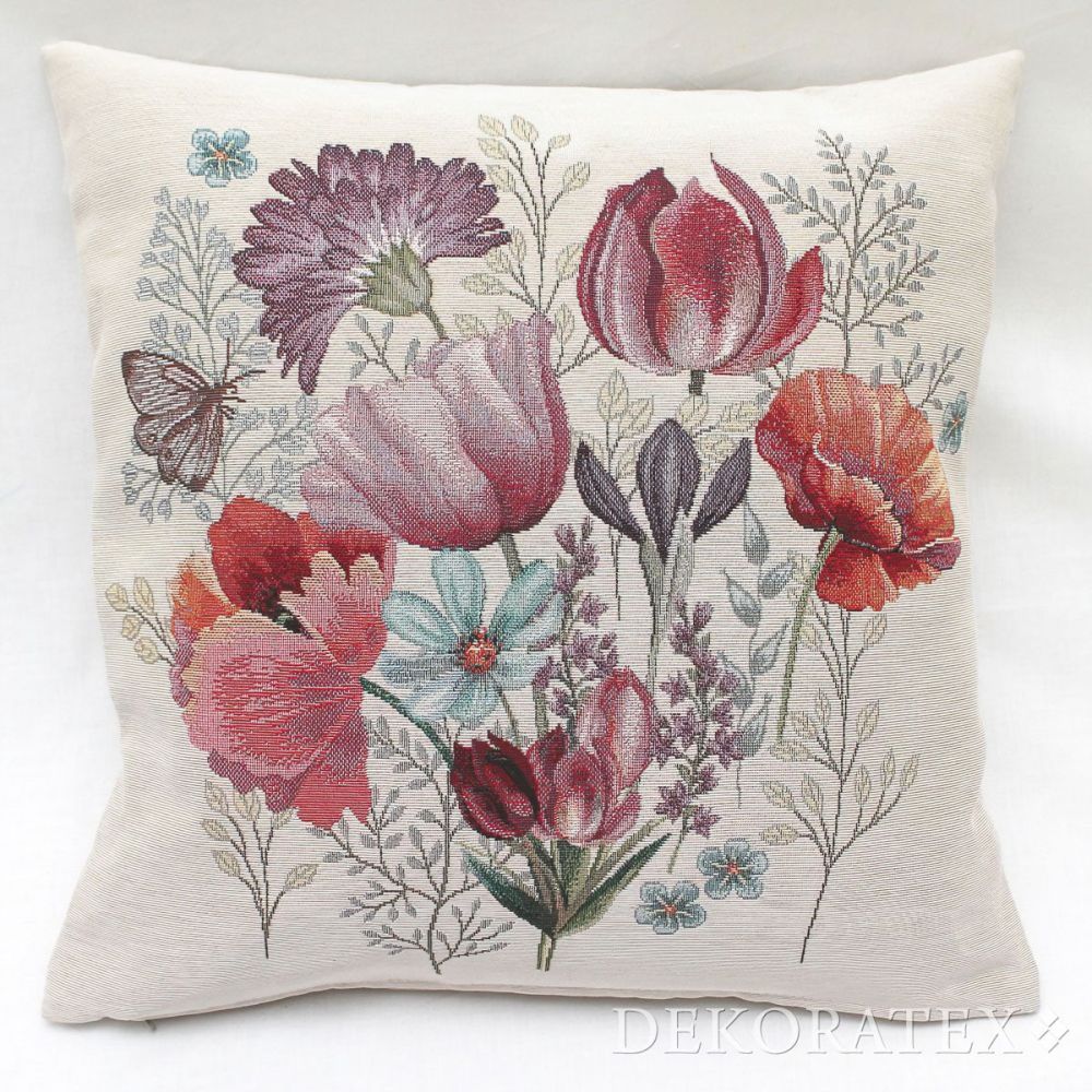Dekorační povlak na polštářek v retro provedení z hustě tkané látky (gobelín) s vysokou gramáží s motivem červených tulipánů a vlčích máků na režném podkladu v rozměru 45 x 45 cm. Vzor na povlaku je oboustranný. Povlak na polštářek je vyroben ze 70% polyesteru a 30% bavlny. Zapínání na ZIP. Povlak je možné objednat samostatně bez výplně, s levnější dekorační výplní nebo luxusnější výplní na spaní.