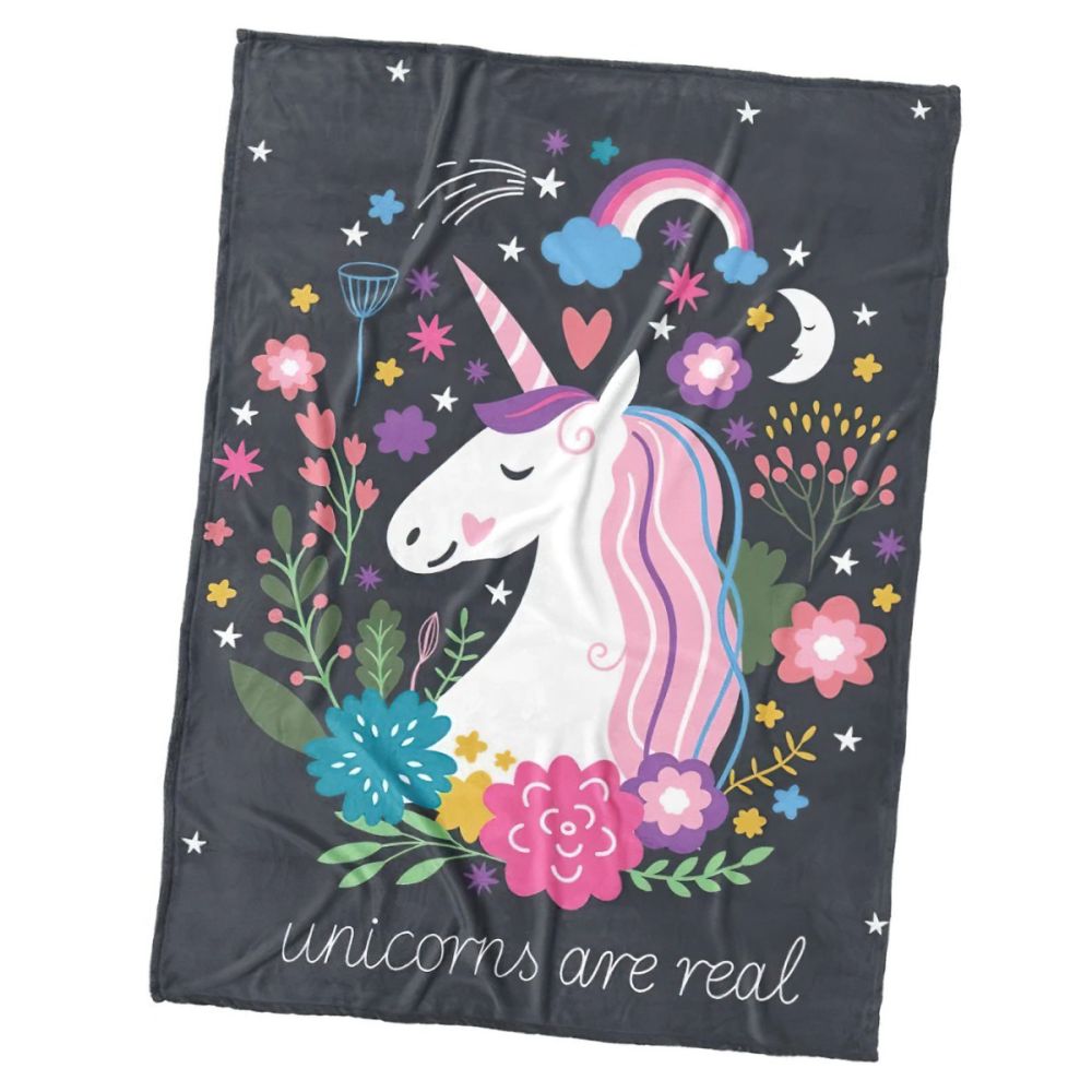 Dětská deka z hřejivého mikrovlákna (mikro fleece) ze 100% polyesteru (gramáží 240 g/m²), neuvěřitelně hebká, jemná, hřejivá a sametová dětská deka. Deka s motivem jednorožce na šedém podkladu. Deka je v rozměru 150 x 200 cm.