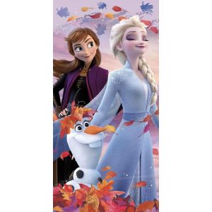 Dětská plážová osuška s motivem hlavních hrdinek Anny, Elsy s vločkami z pohádky Frozen 2 - Ledové království 2 na modrém podkladu. Osuška je z lícové strany s potiskem, z rubu má jemné froté smyčky bez potisku. Osuška je vyrobena ze 100% bavlny s gramáží 320g/m2.