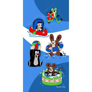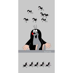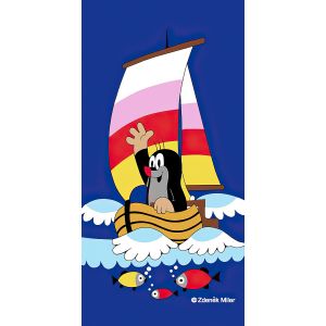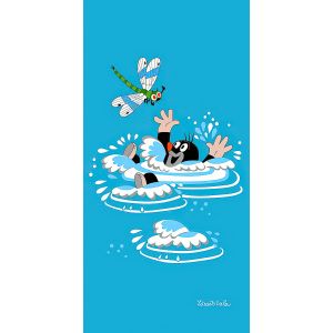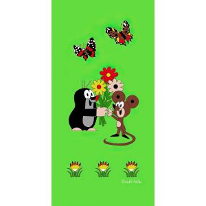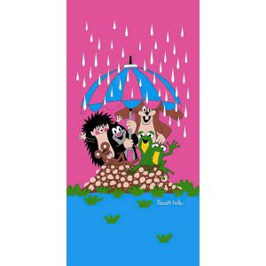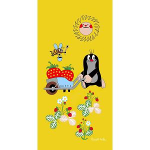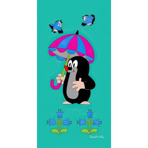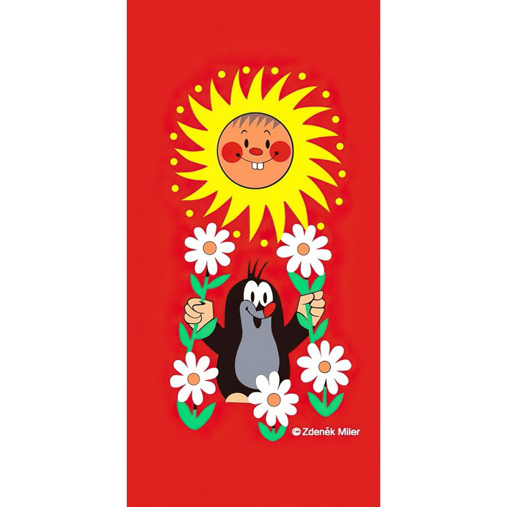 Dětská plážová osuška s motivem pohádkového Krtečka s květinami a zubícím se sluníčkem na červeném podkladu. Osuška je z lícové strany s potiskem, z rubu má jemné froté smyčky bez potisku. Osuška je vyrobena ze 100% bavlny.