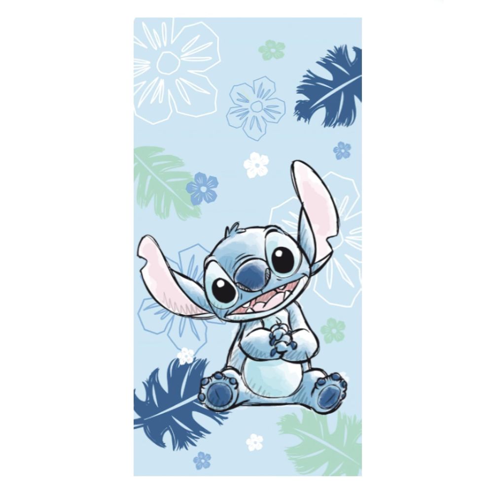 Dětská plážová osuška s motivem s motivem malého pejska Stitche z animované komedie Lilo a Stitch na modrém pozadí s tropickými květinami. Lícní strana osušky je z jemně střiženého froté (velur). Po rubu má jemné froté smyčky bez potisku v bílé barvě. Osuška je vyrobena ze 100% bavlny s gramáží 320g/m2 v rozměru 70 x 140 cm..