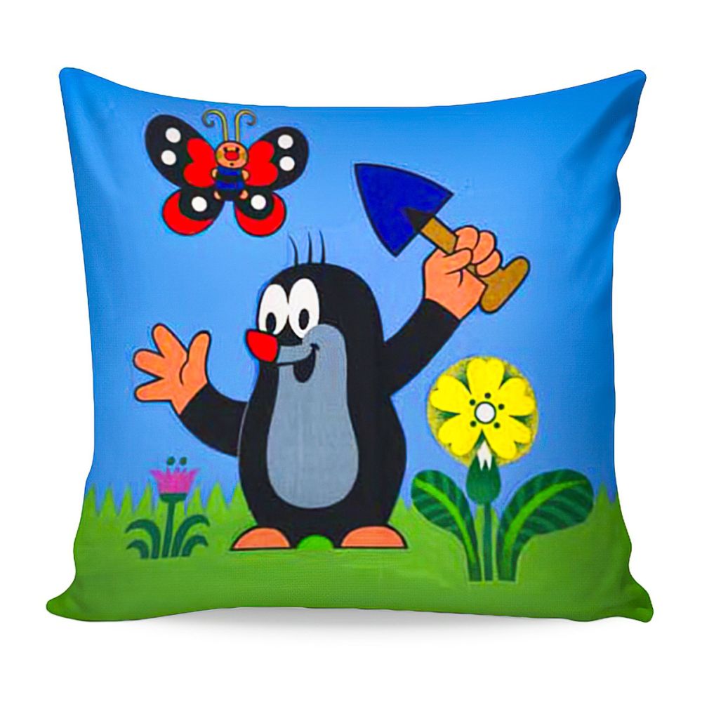 Dětský polštářek s motivem Krtečka s lopatkou z klasického českého animovaného večerníčku na zeleno-modrém podkladu. Povlak je z druhé strany zeleno-modrý se vzorem Krtka s deštníkem se zajícem a ježkem a je potištěný ekologickými barvami digitální technologií. Povlak na polštářek je vyroben ze 100% bavlny a je opatřen zapínáním na ZIP. Výplň je tvořena ze 100% polyesteru (kuličky z dutého vlákna).