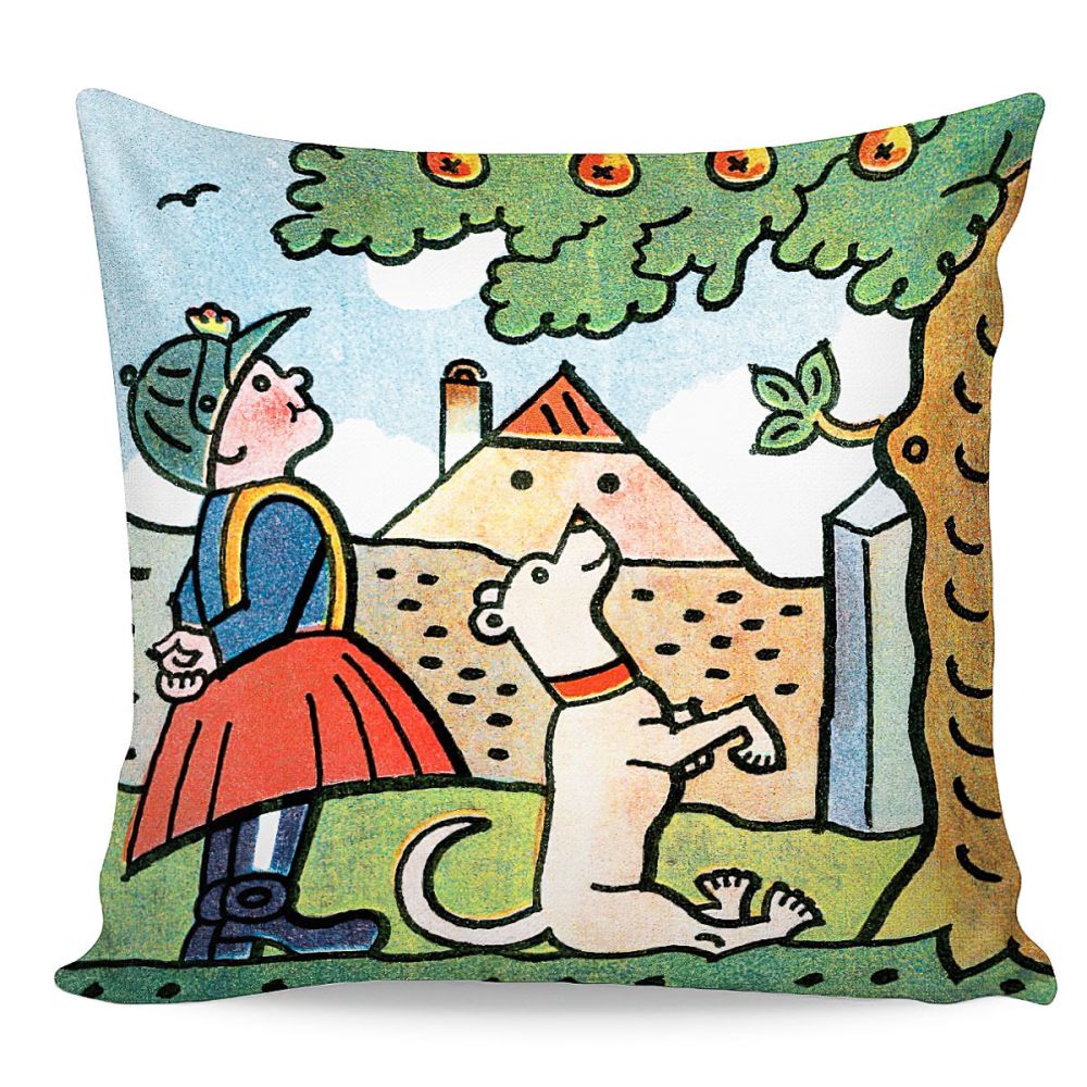 Dětský polštářek s vesnickým motivem v typické kresbě Josefa Lady v zelených a světle modrých odstínech. Povlak má z obou stran stejný vzor a je potištěný ekologickými barvami digitální technologií. Povlak na polštářek je vyroben ze 100% bavlny a je opatřen zapínáním na ZIP. Povlak je možné objednat samostatně bez výplně, s levnější dekorační výplní nebo luxusnější výplní na spaní.