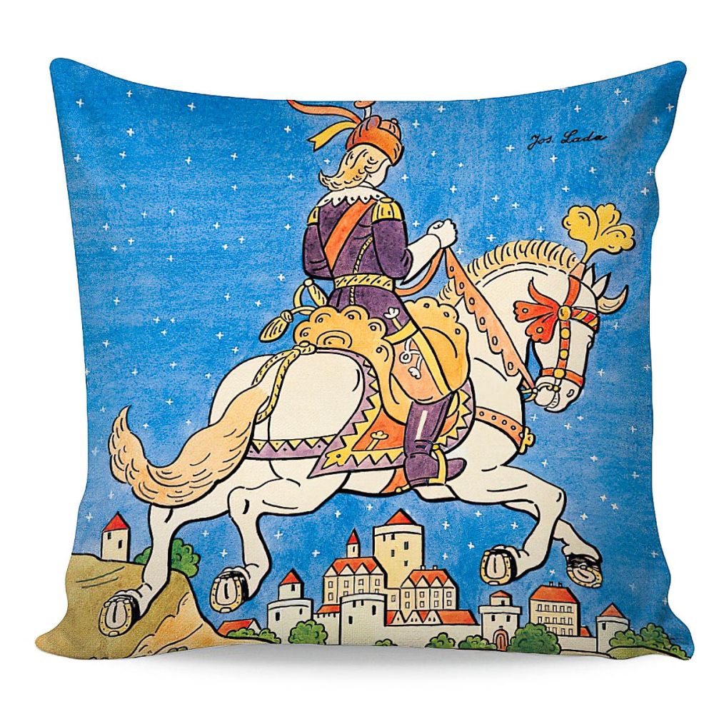 Dětský polštářek s pohádkovým motivem v typické kresbě Josefa Lady ve modrých odstínech. Povlak má z obou stran stejný vzor a je potištěný ekologickými barvami digitální technologií. Povlak na polštářek je vyroben ze 100% bavlny a je opatřen zapínáním na ZIP. Povlak je možné objednat samostatně bez výplně, s levnější dekorační výplní nebo luxusnější výplní na spaní.