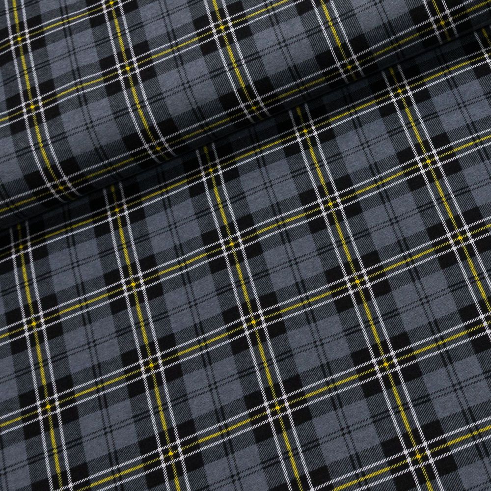 Flanelová bavlněná látka (tkanina) se vzorem šedo-žlutého kára. Látka je v šířce 150 cm a je vyrobena ze 100% bavlny (gramáž 170g/m2) v plátnové vazbě. Látka je odolná proti roztržení a tření a vyznačuje se stálostí barev. Vzor látky je natištěn jen z jedné strany, z druhé strany je látka bez potisku.