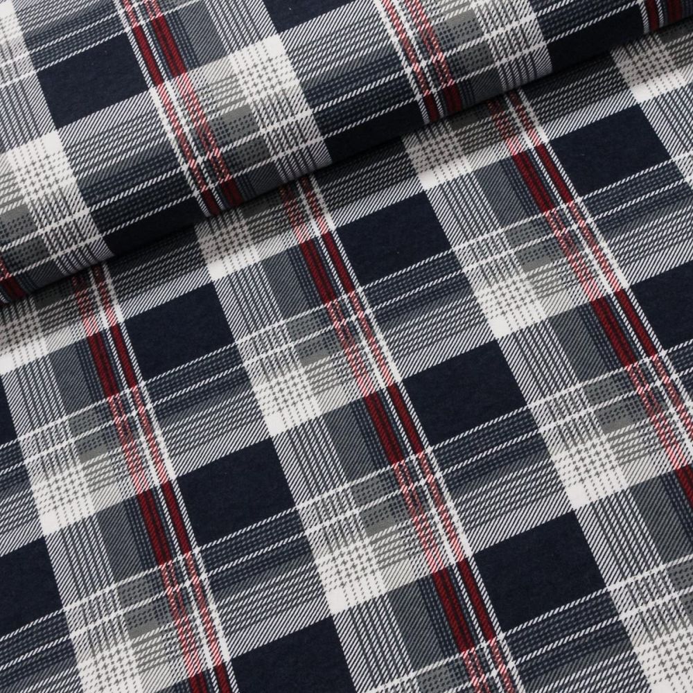 Flanelová bavlněná látka (tkanina) se vzorem kára v modro-šedé barvě. Látka je v šířce 150 cm a je vyrobena ze 100% bavlny (gramáž 170g/m2) v plátnové vazbě. Látka je odolná proti roztržení a tření a vyznačuje se stálostí barev. Vzor látky je natištěn jen z jedné strany, z druhé strany je látka bez potisku.