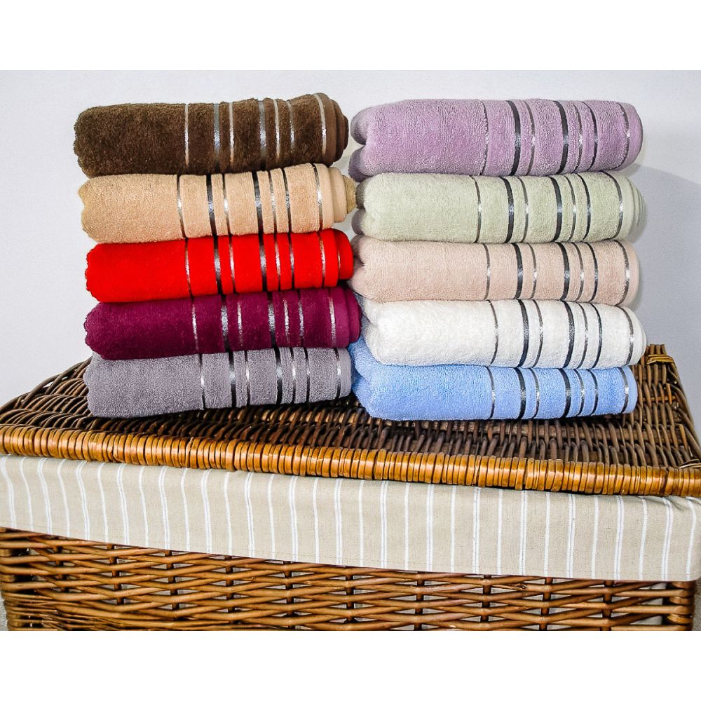 Bavlněný froté malý ručník (40x60cm), ručník (50x100cm) a osuška (70x140cm) s proužkovanou bordurou ve spodní části. Ručníky a osušky jsou vyrobeny z vysoce kvalitní 100% bavlny s vysokou gramáží, díky čemuž jsou velmi hebké, savé a mají nadýchaný vzhled. Ručníky a osušky jsou vybaveny praktickým poutkem na zavěšení. Vyrobeny jsou v gramáži 450g/m2.