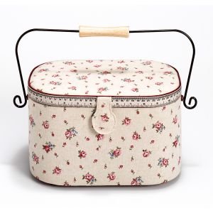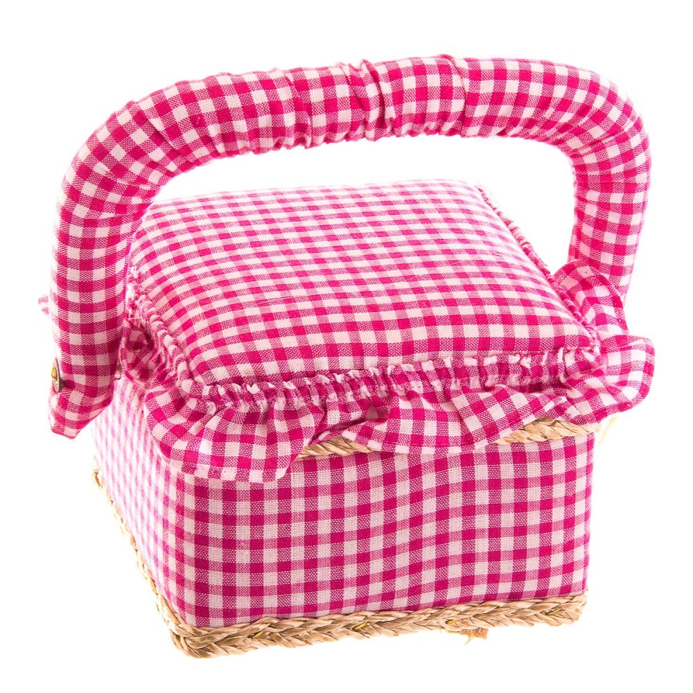 Čalouněná kazeta na uložení šících potřeb se vzorem růžových kostiček. Košík na šití pojme nůžky, jehly, špendlíky, nitě, metry a další krejčovské potřeby. Na vnitřní straně víka se nachází praktický jehelníček. Šitíčko je vyrobeno s textilním víkem a boky. Rozměry košíku jsou 12,5 cm x 12,5 cm a výška činí 10 cm. je tedy malé, vhodné na drobnější věci nebo na základní výbavu pro malé švadlenky.