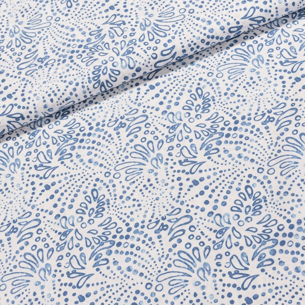 Bavlněná látka košilovina se vzorem modrých ornamentů na bílém podkladu. Látka je vhodná na výrobu letních lehkých šatů, sukní, halenek, košilí. Látka je v šířce 145 cm, vyrobena z 97% bavlny a 3% elastanu (115 g/m2). Látka má vzor z jedné strany, z druhé strany je bez potisku.