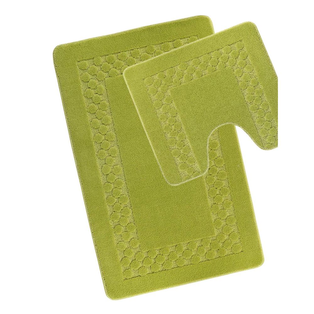 Koupelnové předložky s motivem koleček tvořící obdélníkový střed koberečku v zelené barvě z kolekce Standard jsou vyrobeny ze 100% polypropylenu. Latexový nátěr na rubu předložky vytváří protiskluzový povrch. Velká souprava se skládá z předložky do koupelny 60 x 100 cm a předložky před WC 60 x 50 cm (lze objednat samostatně) a malá sada se skládá z předložky do koupelny v rozměru 80 x 50 cm a předložky před WC 50 x 40 cm.