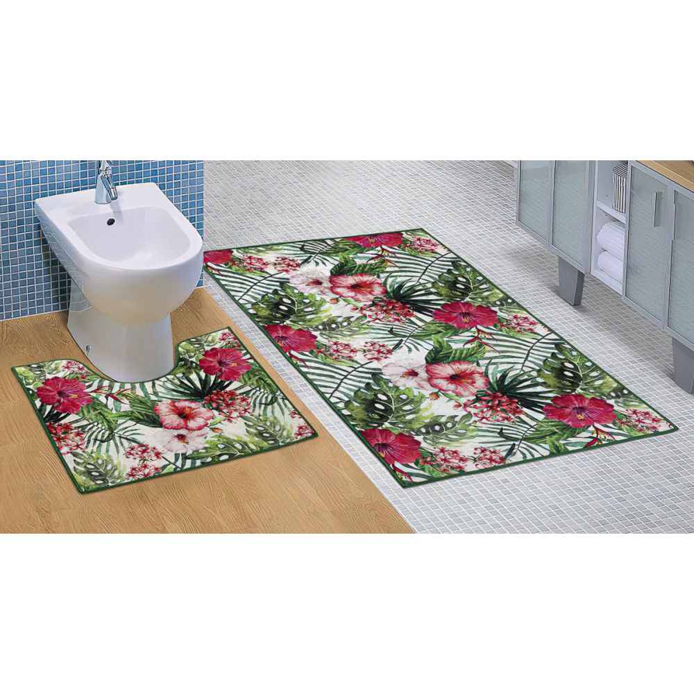 Koupelnová souprava 3D FOTOTISK IBIŠEK, zelené listy monstera a červené květy, 100x60cm (předložka) + 60x50cm (na WC)