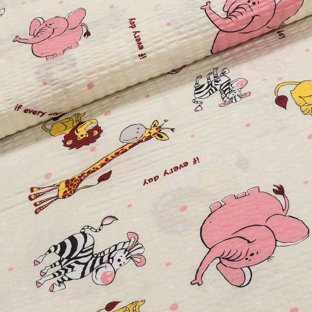 Bavlněný krep se vzorem zvířat na smetanovém podkladu. Krepová látka je v šířce 145 cm a je vyrobena ze 100% bavlny. Látka je potištěna z jedné strany.