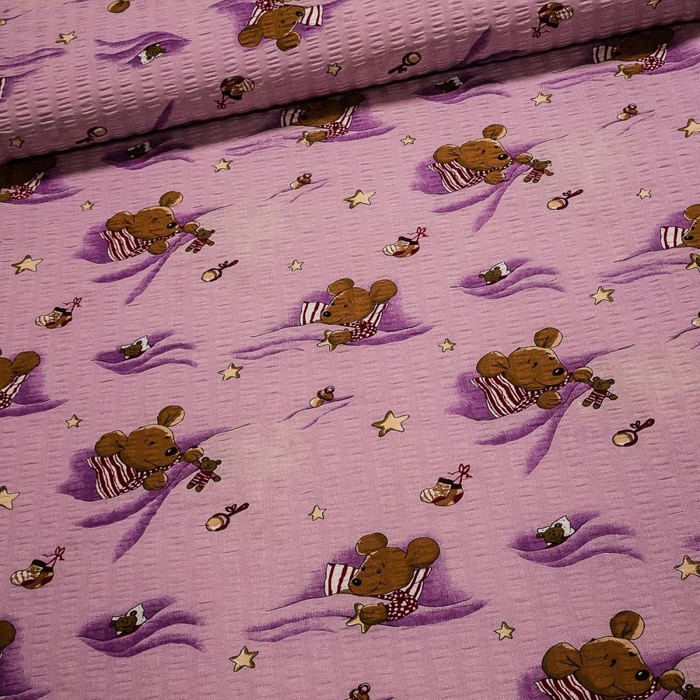 Bavlněný krep s motivem medvídka na peřince s hračkami na fialovém pozadí. Krepová látka je v šířce 140 cm a je vyrobena ze 100% bavlny. Vzor na látce je natištěn jen z jedné strany.