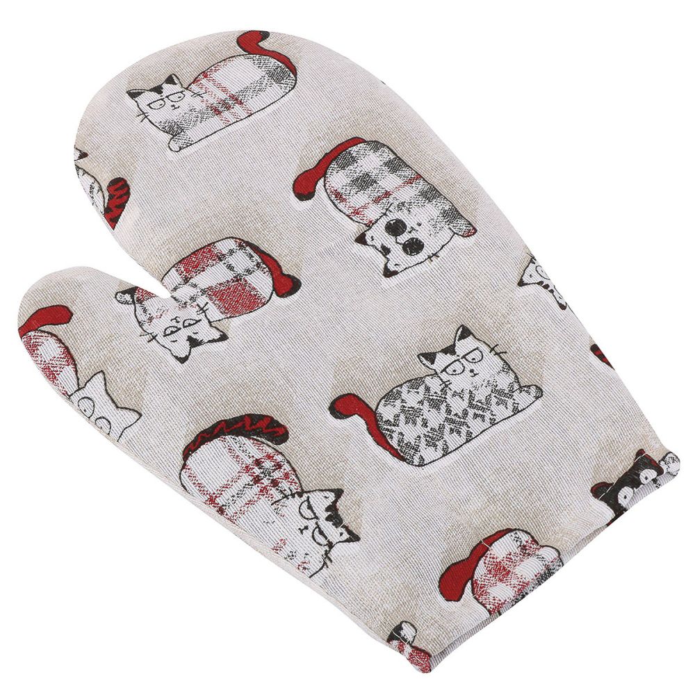 Kuchyňská chňapka (rukavice) se vzorem kreslených červených kočiček na režném podkladu. Chňapka je v rozměru 28x18cm a je vyrobena z kombinace 70% bavlny a 30% polyesteru. Výplň je z netkané textilie. Chňapka má magnet i poutko na zavěšení a díky své tloušťce dostatečně ochrání před horkými hrnci a předměty.