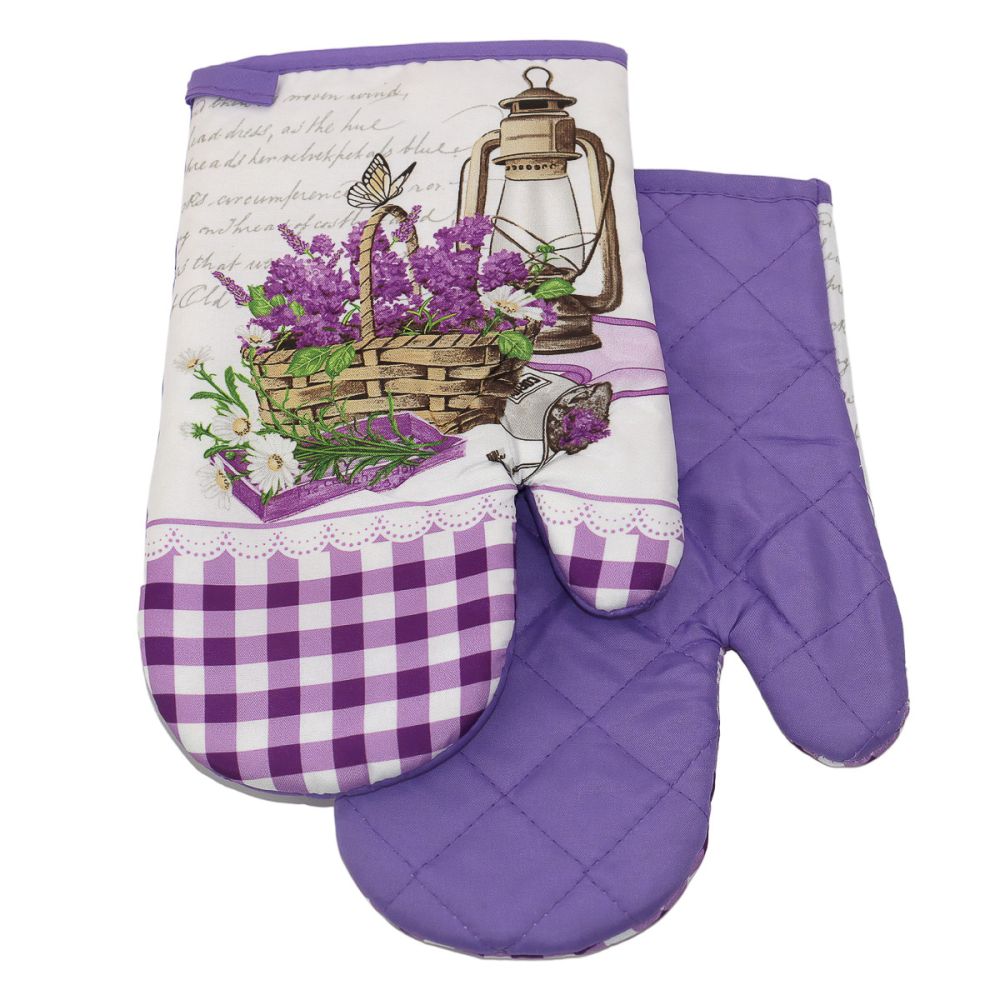 Kuchyňská chňapka (rukavice) se vzorem levandule a lucerny. Z vnitřní strany je chňapka jednobarevná ve fialové barvě. Chňapka má našité poutko na zavěšení i uvnitř všitý magnet. Chňapka je v rozměru 27x18cm a je vyrobena ze 100% polyesteru s výplní ze 100% polypropylenu. Balení obsahuje 2 kusy chňapek na levou a pravou ruku.