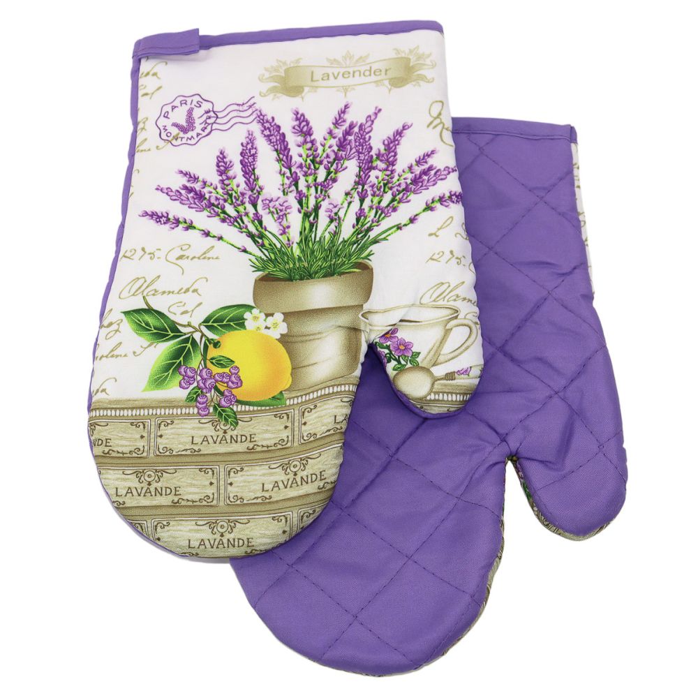 Kuchyňská chňapka (rukavice) se vzorem levandule a citrónu. Z vnitřní strany je chňapka jednobarevná ve fialové barvě. Chňapka má našité poutko na zavěšení i uvnitř všitý magnet. Chňapka je v rozměru 27x18cm a je vyrobena ze 100% polyesteru s výplní ze 100% polypropylenu. Balení obsahuje 2 kusy chňapek na levou a pravou ruku.