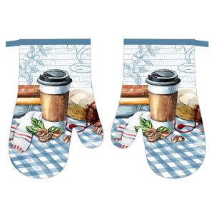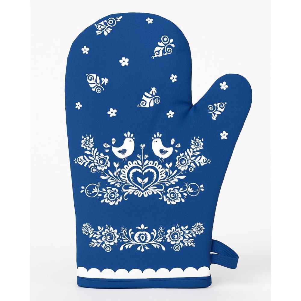 Kuchyňská chňapka (rukavice) s kuchyňským oboustranným s folklórním vzorem v modrém provedení. Chňapka má všitý magnet a poutko na zavěšení. Chňapka je v rozměru 28x18cm a je vyrobena ze 100% bavlny s výplní ze 100% polyesteru (rouno z dutého vlákna).