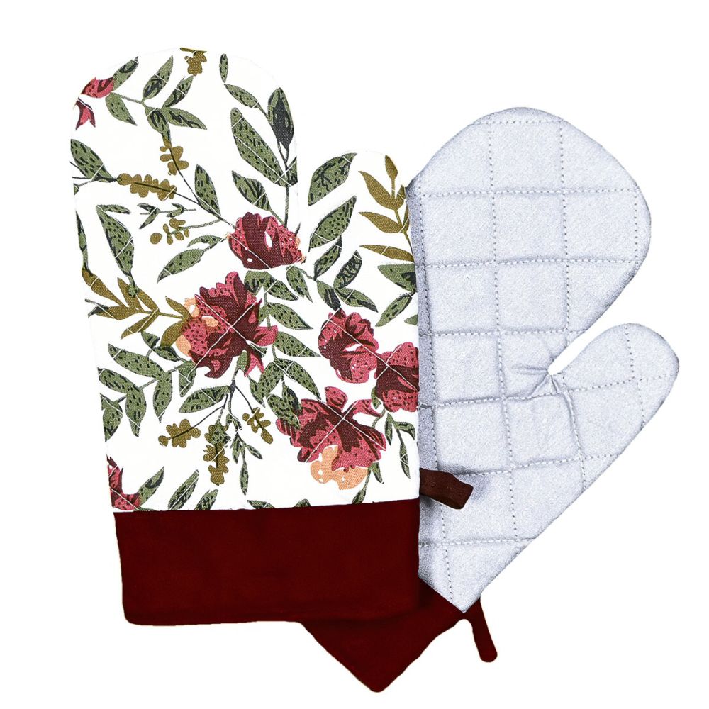 Kuchyňská chňapka (rukavice) se vzorem vínových květů na bílém podkladu. Chňapka má poutko na zavěšení i všitý magnet. Chňapka je v rozměru 28x18cm a je vyrobena ze 100% polyesteru s výplní ze 100% polypropylenu ve spodní části potažená teflonem. Balení obsahuje 2 kusy chňapek na levou a pravou ruku.