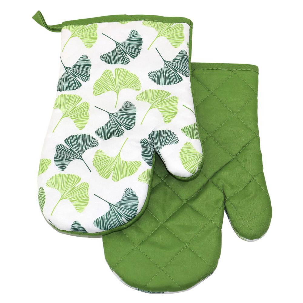 Kuchyňská chňapka (rukavice) se vzorem listů rostlinky ginko. Z vnitřní strany je chňapka jednobarevná v zelené barvě. Chňapka má našité poutko na zavěšení i uvnitř všitý magnet. Chňapka je v rozměru 27x18cm a je vyrobena ze 100% polyesteru s výplní ze 100% polypropylenu. Balení obsahuje 2 kusy chňapek na levou a pravou ruku.