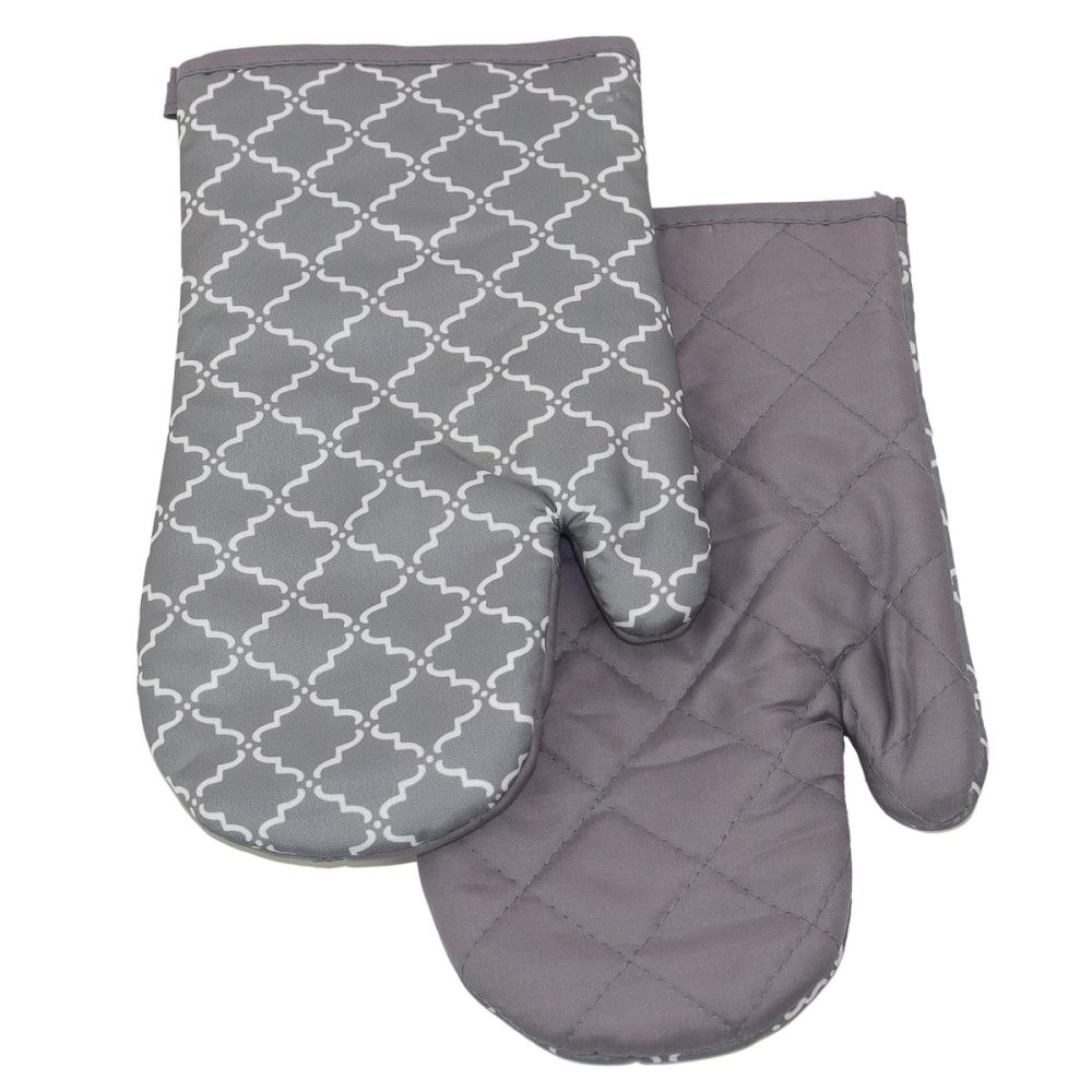 Kuchyňská chňapka (rukavice) se vzorem bílého ornamentu na šedém podkladu. Z vnitřní strany je chňapka jednobarevná v šedé barvě. Chňapka má našité poutko na zavěšení i uvnitř všitý magnet. Chňapka je v rozměru 27x18cm a je vyrobena ze 100% polyesteru s výplní ze 100% polypropylenu. Balení obsahuje 2 kusy chňapek na levou a pravou ruku.
