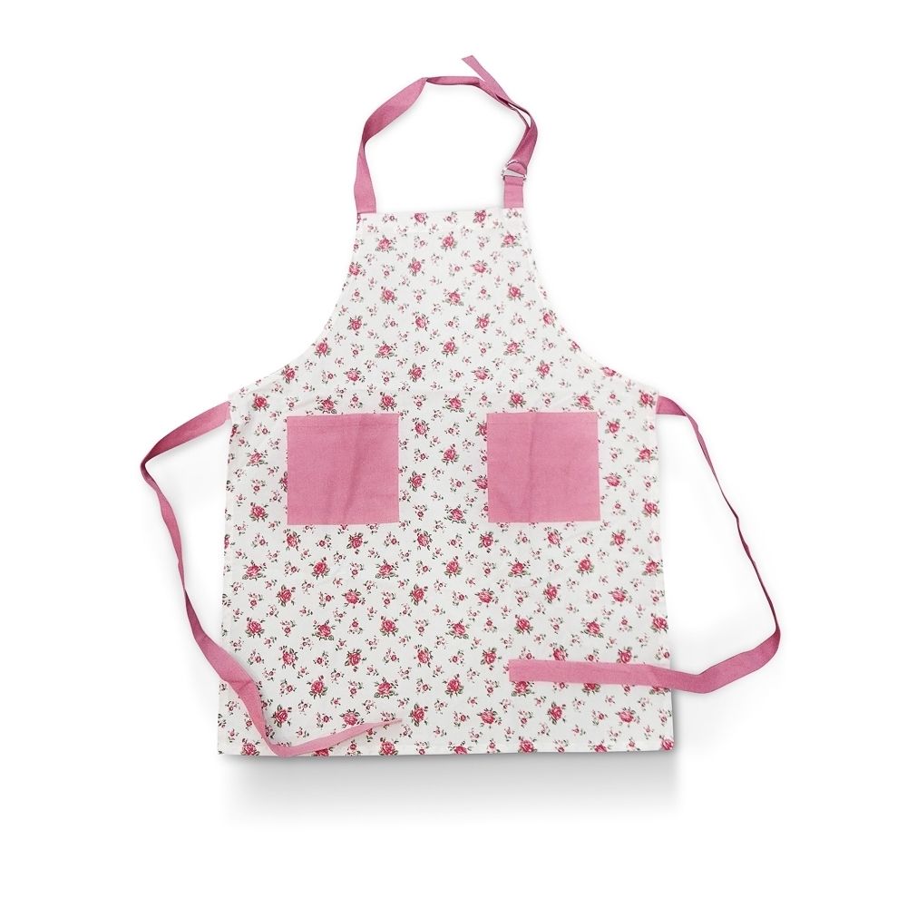 Kuchyňská zástěra je vyrobena ze 100% bavlny v rozměru 60x75 cm s motivem růžových květinek na bílém pozadí.