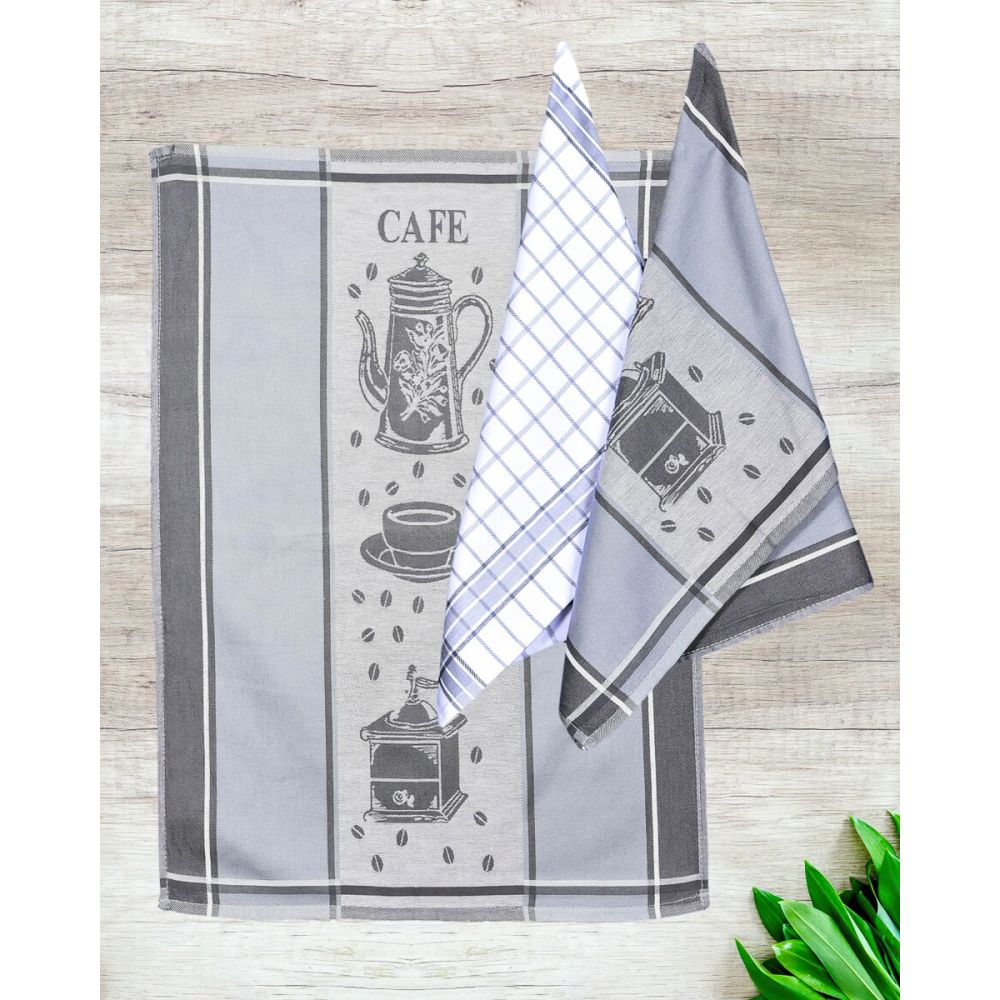 Souprava tří kusů kuchyňských utěrek z exkluzivní egyptské bavlny v rozměru 50x70cm se vzorem kávy a kára v šedých barvách. Utěrky z egyptské bavlny jsou vyrobeny z kvalitní bavlněné příze gramáž 230g/m2.
