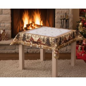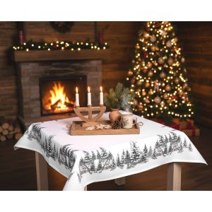 Kuchyňský ubrus s vánočním vzorem zlatých baněk na šedém podkladu, je vyroben ze 100 % polyesteru ve čtvercovém rozměru 85x85cm.