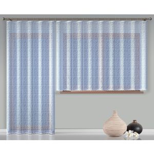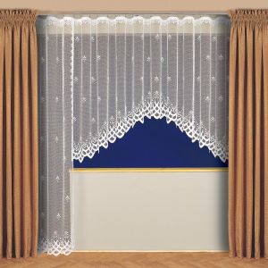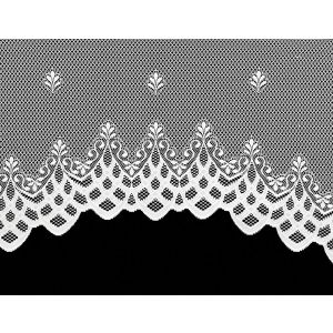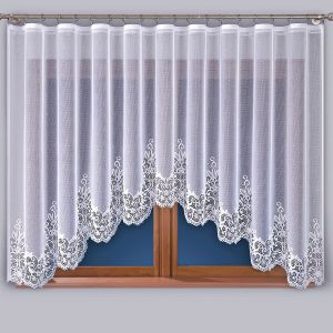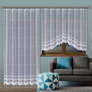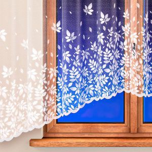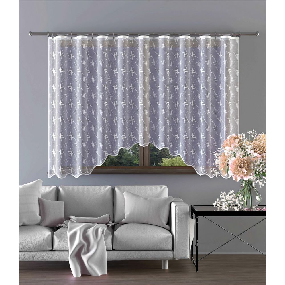 Hotová jemná žakárová záclona s celoplošným vzorem překřížených vlnek v jednobarevné bílé barvě. Záclona je vyrobena ze 100% polyesteru v různých výškách a šířkách. Záclona má z výroby pevné boční i horní okraje, bez řasící stužky. Výška záclony je měřena v nejdelším místě.