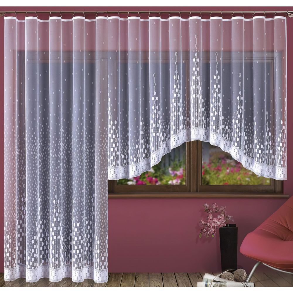 Hotová jemná žakárová záclona se vzorem oválků a koleček v jednobarevné bílé barvě. Záclona je vyrobena ze 100% polyesteru v různých výškách a šířkách. Záclona má z výroby pevné boční i horní okraje, bez řasící stužky. Výška záclony je měřena v nejdelším místě.