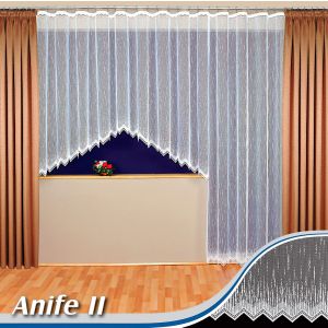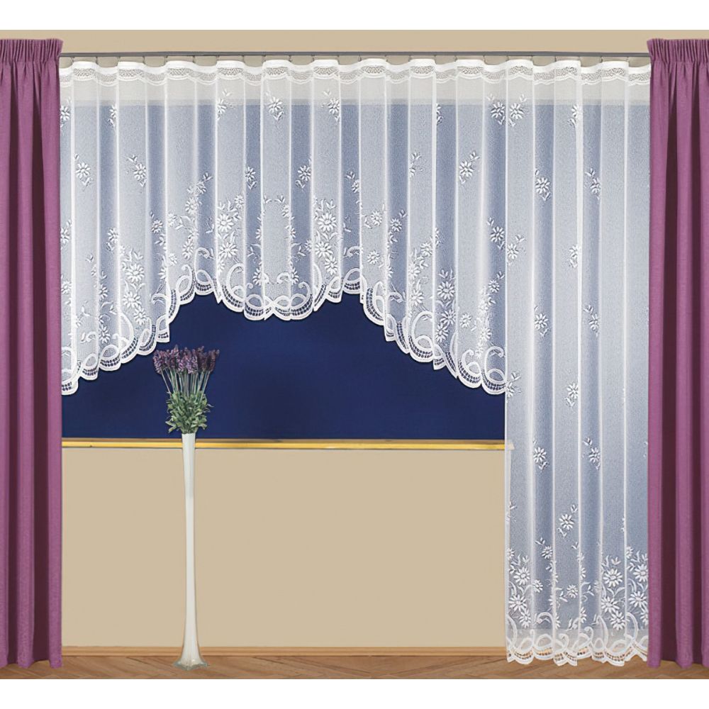 Hotová jemná žakárová záclona s květinovým vzorem na hustém podkladu v jednobarevné bílé barvě. Záclona je vyrobena ze 100% polyesteru v různých výškách a šířkách. Záclona má z výroby pevné boční i horní okraje, bez řasící stužky. Výška záclony je měřena v nejdelším místě.
