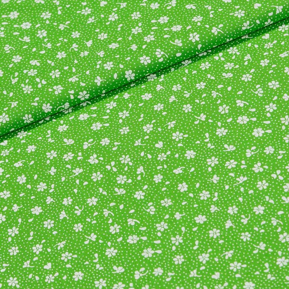 Bavlněná látka (tkanina) s motivem bílých květinek na zelené. Látka je v šířce 160 cm, vyrobena ze 100% bavlny (gramáž 135g/m2) v plátnové vazbě. Vzor látky je natištěn jen z jedné strany z druhé strany je látka bez potisku.