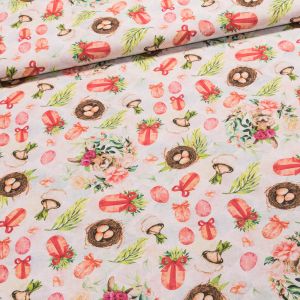 Směsová látka (tkanina) se vzorem listů v šedo-hnědé barvě. Látka je v šířce 140 cm a je vyrobena z 55% bavlny a 45% polyesteru. Motiv na látce je pouze z jedné strany, z druhé je látka bez potisku.