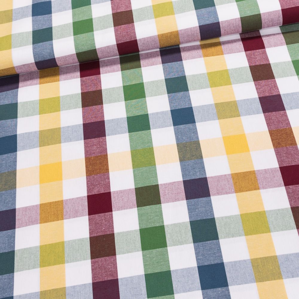 Bavlněný kanafas od českého výrobce čtverečkovaný, pestře tkaný (3,5 x 3,5 cm) ve žluto-modro-zelených barvách. Látka je v šířce 140 cm, vyrobena ze 100% bavlny (gramáž 177g/m2) v plátnové vazbě. Vzor látky je vytkávaný, a je tedy z obou stran stejný.