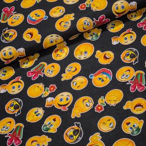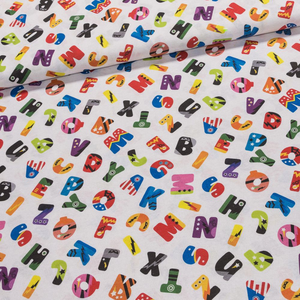 Směsová látka (tkanina) se vzorem mnohobarevných písmen na bílém podkladu. Látka je v šířce 140 cm a je vyrobena z 55% bavlny a 45% polyesteru. Motiv na látce je pouze z jedné strany, z druhé je látka bez potisku.