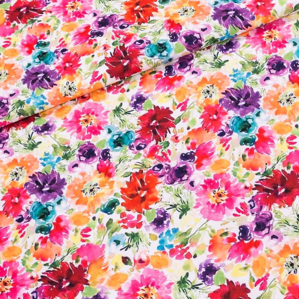 Polyesterová látka (šatovka) se vzorem fialových, tyrkysových, červených a oranžových květů. Látka je vhodná na výrobu šatů, sukní, halenek, košilí, košilových šatů či kalhot. Látka je v šířce 150 cm, vyrobena z 95% polyesteru a 5% elastanu (140g/m). Látka má vzor jen z jedné strany z druhé strany je bez potisku.