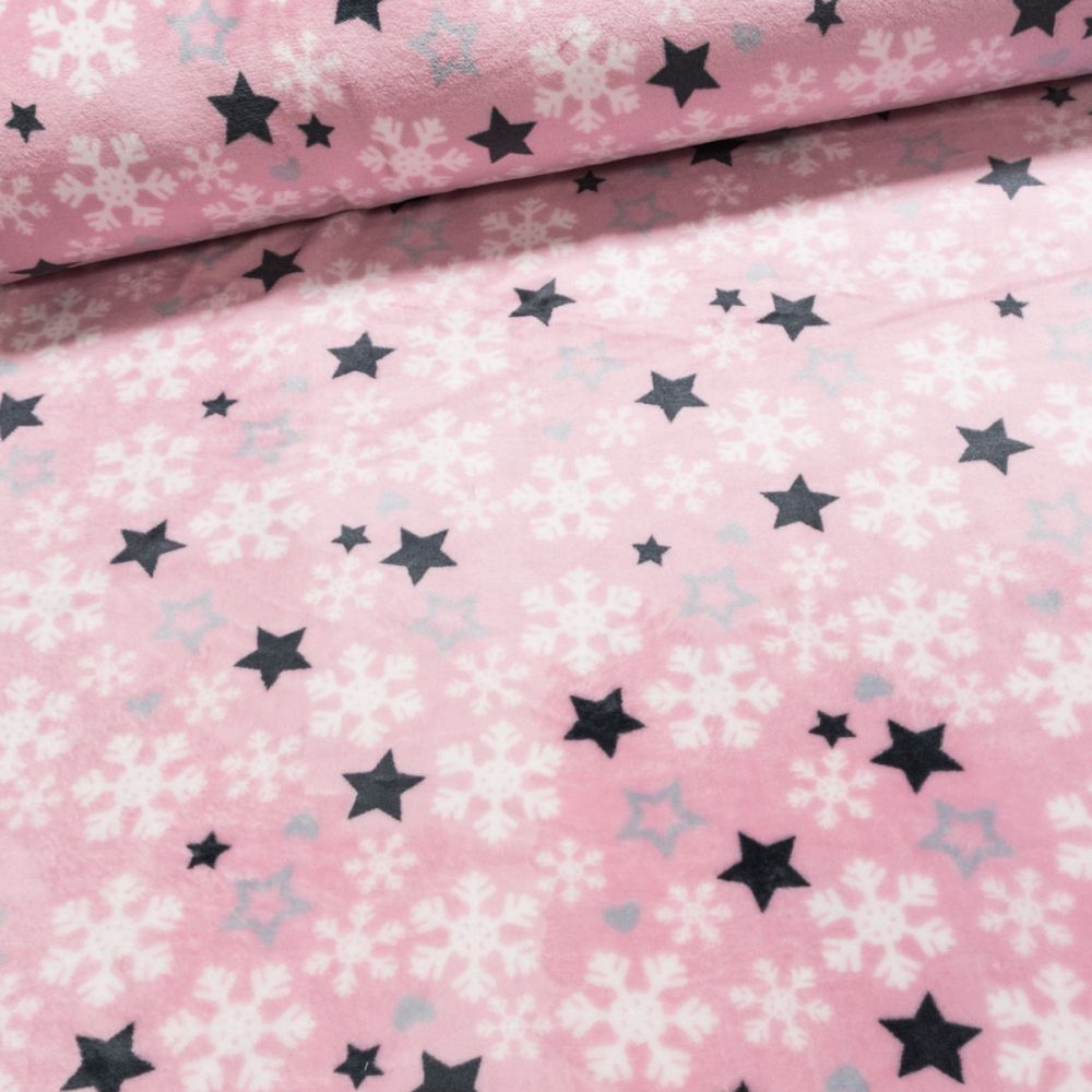 Mikroflanel (flanel fleece) se vzorem šedých hvězd a bílých vloček na růžovém podkladu. Látka je v šířce 150 cm a je vyrobena ze 100% polyesteru (grarmáž 300g/m2). Látka je oboustranná, rubová strana má chloupek vyšší. Látka je vhodná na župany, mikiny, čepice, šály, pyžama tak i na výrobu dek či polštářků.
