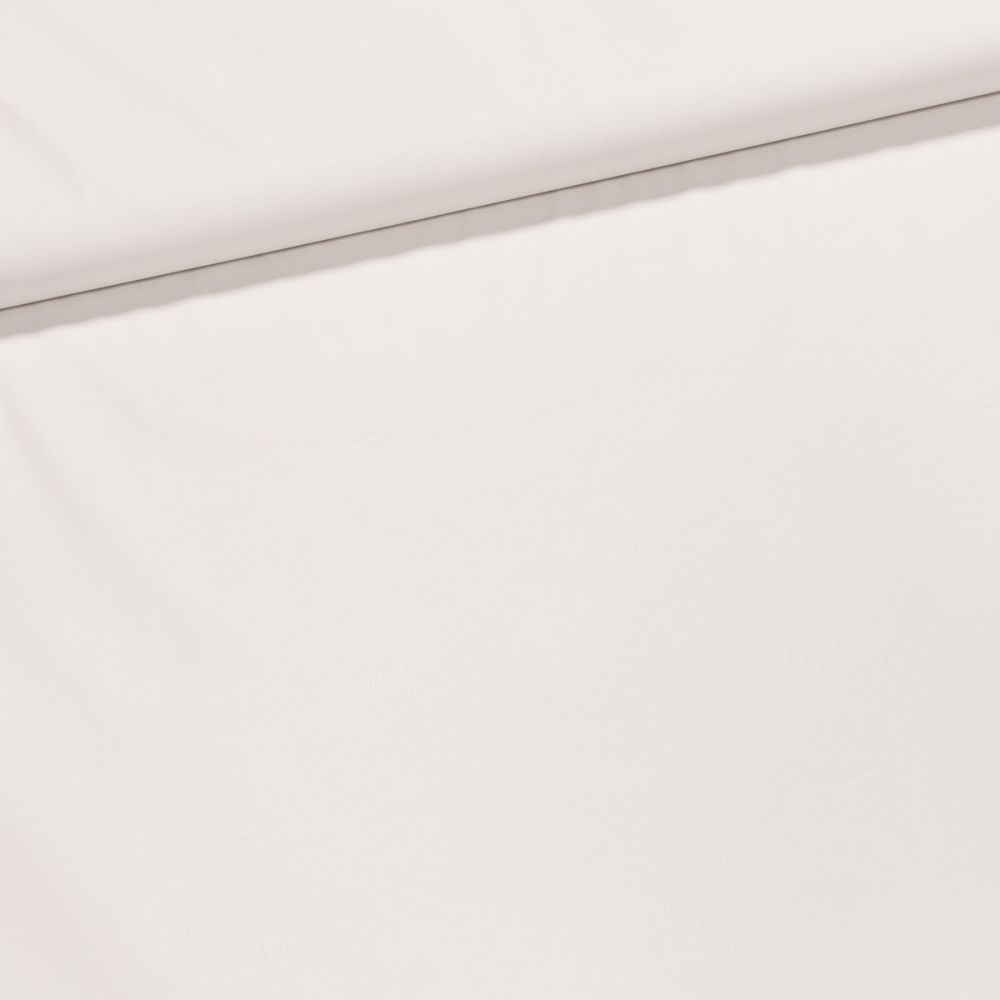 Umělá koženka v bílé barvě. Umělá kůže je v šířce 140 cm a je vyrobena ze 97% polyesteru a 3% elastanu. Tato koženka je v měkkém jemném provedení a díky elastickému úpletu z rubové strany je vhodná na oděvy jako jsou kalhoty, sukně, saka či bundy.