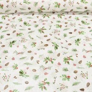 Omyvatelná PVC ubrusovina s podkladem z netkané textilie se vzorem zlatých vánočních ozdob na béžovém pozadí s hladkým povrchem. Ubrus je dostupný v metráži o šířce 140cm.