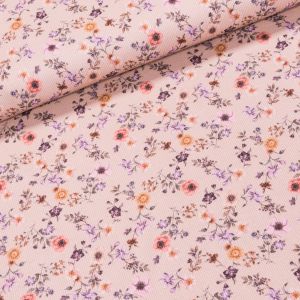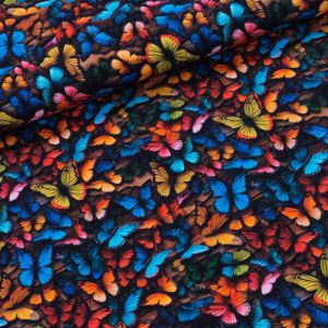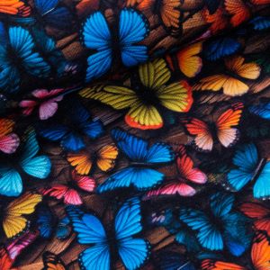 Elastický bavlněný úplet (jersey) se vzorem růžových cákanců jakoby od barvy na černém podkladu. Látka je v šířce 180 cm, vyrobena z 95% bavlny a 5% elastanu (gramáž 240g/m2). Úplet je vhodný zejména na mikiny, kalhoty, sukně, topy, tuniky, kardigany či tepláky. Látka má vzor z jedné strany, z druhé strany je bez potisku.