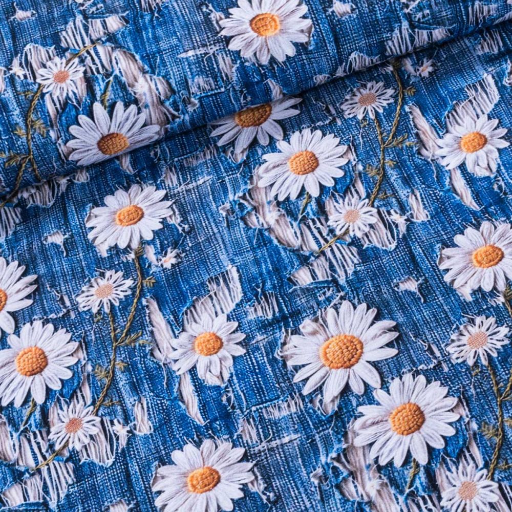 Elastický úplet (jersey) se vzorem kopretina na podkladu ze vzorem modré rifloviny. Látka je v šířce 145 cm, vyrobena ze 95% bavlny a 5% elastanu (gramáž 250g/m2). Látka je vhodná na tepláky, elasťáky, šaty, sukně, mikiny, čepice či nákrčníky. Látka má vzor z jedné strany z druhé strany je bez potisku.