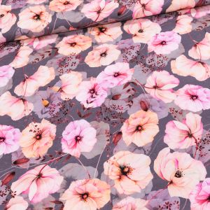 - Viskózový úplet 403143/01, žluté a růžové vlčí máky na šedé, š.145cm (látka v metráži)493 Kč