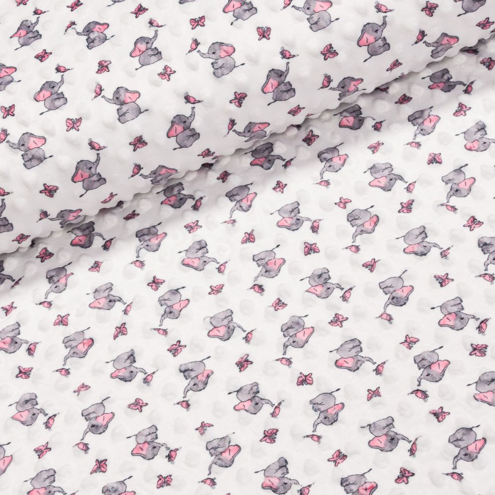 Minky fleece (mikroplyš) se vzorem šedo-růžových sloníků a motýlků na bílém podkladu s vystouplými puntíky (čudlíky). Látka je v šířce 145 cm (250g/m2) a je vyrobena z heboučkého 100% mikropolyesteru s chlupem a protlačovaným vzorem (vzor i chlup je jen z jedné strany).