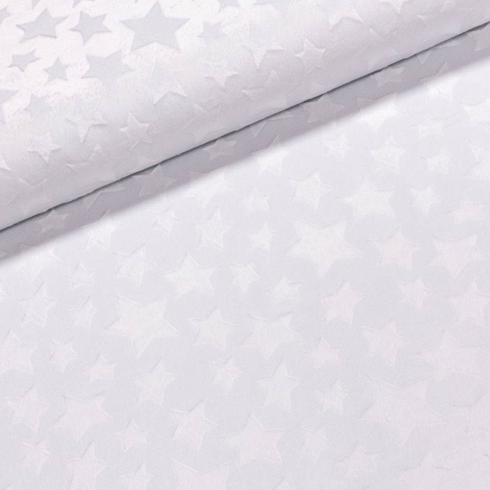 Minky fleece (mikroplyš) v jednobarevné bílé barvě s vystouplými hvězdami. Látka je v šířce 150 cm (250g/m2) a je vyrobena z heboučkého 100% mikropolyesteru s chlupem a protlačovaným vzorem (vzor i chlup je jen z jedné strany).