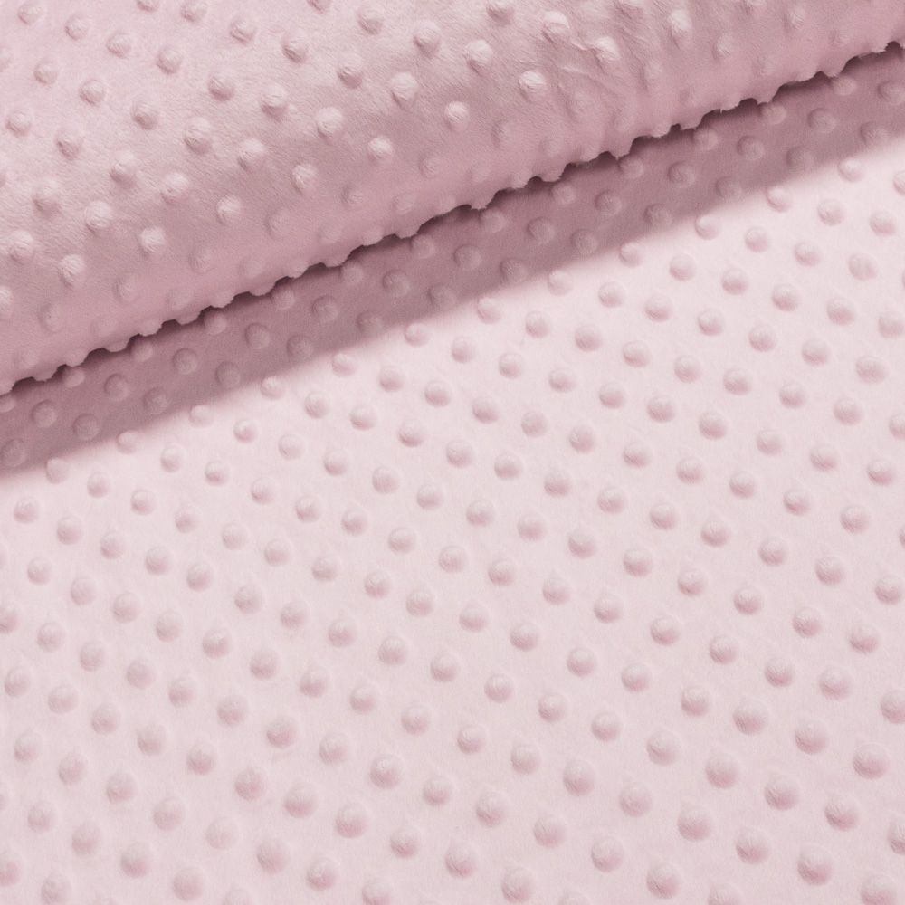 Minky fleece (mikroplyš) v jednobarevné světlunce (baby) růžové barvě s nádechem zlaté barvy s vystouplými puntíky (čudlíky). Látka je v šířce 150 cm a je vyrobena z heboučkého 100% mikropolyesteru s chlupem a protlačovaným vzorem (vzor i chlup je jen z jedné strany).